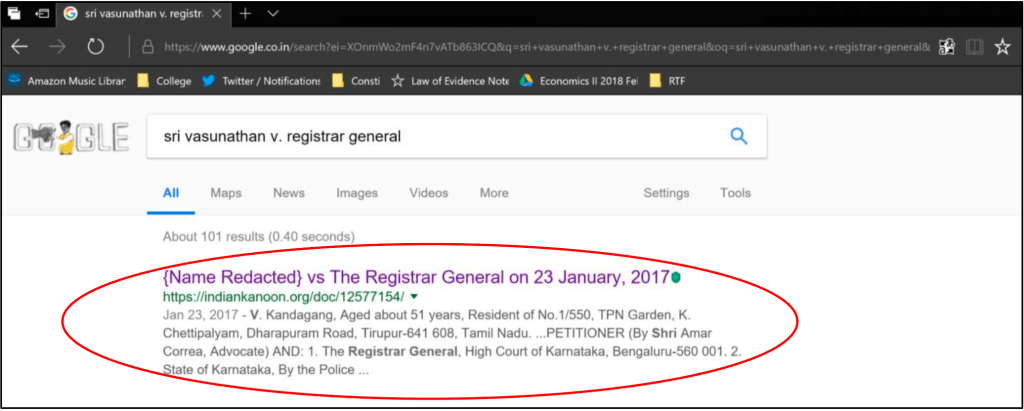The petitioners in the case of Dharamraj Bhanushankar Dave v. State of Gujarat[18] sought the removal of a URL containing a ‘non-reportable judgement’ that was hosted by the legal website IndiaKanoon.com and showed on Google Search. He contended that the publication was violative of Article 21 of the Constitution and had adversely affected his personal and professional life. The High Court of Gujarat however observed that “mere publication on the website is not tantamount to reporting” and that there was no violation of the petitioner’s fundamental right to life with dignity.[19]